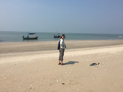 By the end of our first full day of birding I was exhausted and tried to get Fred to keep me from falling asleep by reenacting the Titanic (Thai-tanic?) "flying" scene on this boat on the beach by our hotel but for some reason he declined.